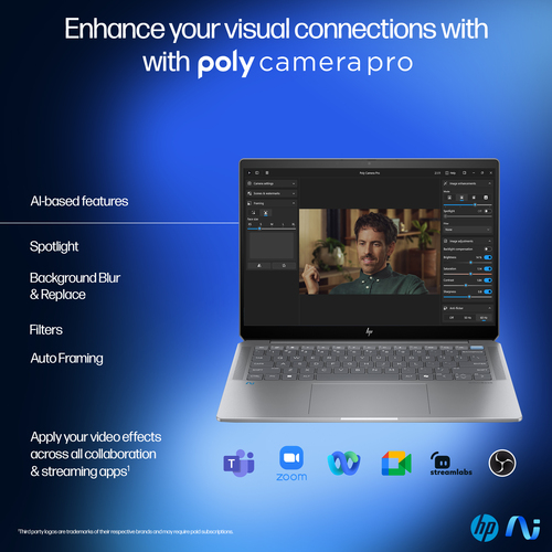 [2] Based on HP’s internal analysis as of next gen PC’s with a 40-60 TOPS NPU as of (current date). Battery life tested by HP using continuous FHD video playback, 1080p (1920x1080) resolution, 200 nits brightness, system audio level as image default, player audio level at 100%, played full-screen from local storage, headphone attached or through speaker (if no audio jack port), wireless on but not connected. Actual ... Show More